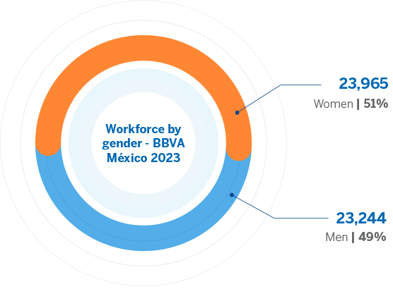 Grupo BBVA places employees at the center of its values. The value “We are one team” guides the design and implementation of personnel management processes. At BBVA México, commitment, trust, and pride in being part of BBVA are experienced throughout an employee’s lifecycle, from the selection of new hires to the end of the employment relationship. This includes processes such as role assignment, evaluation, development, and training, with consideration for diversity and inclusion aspects.